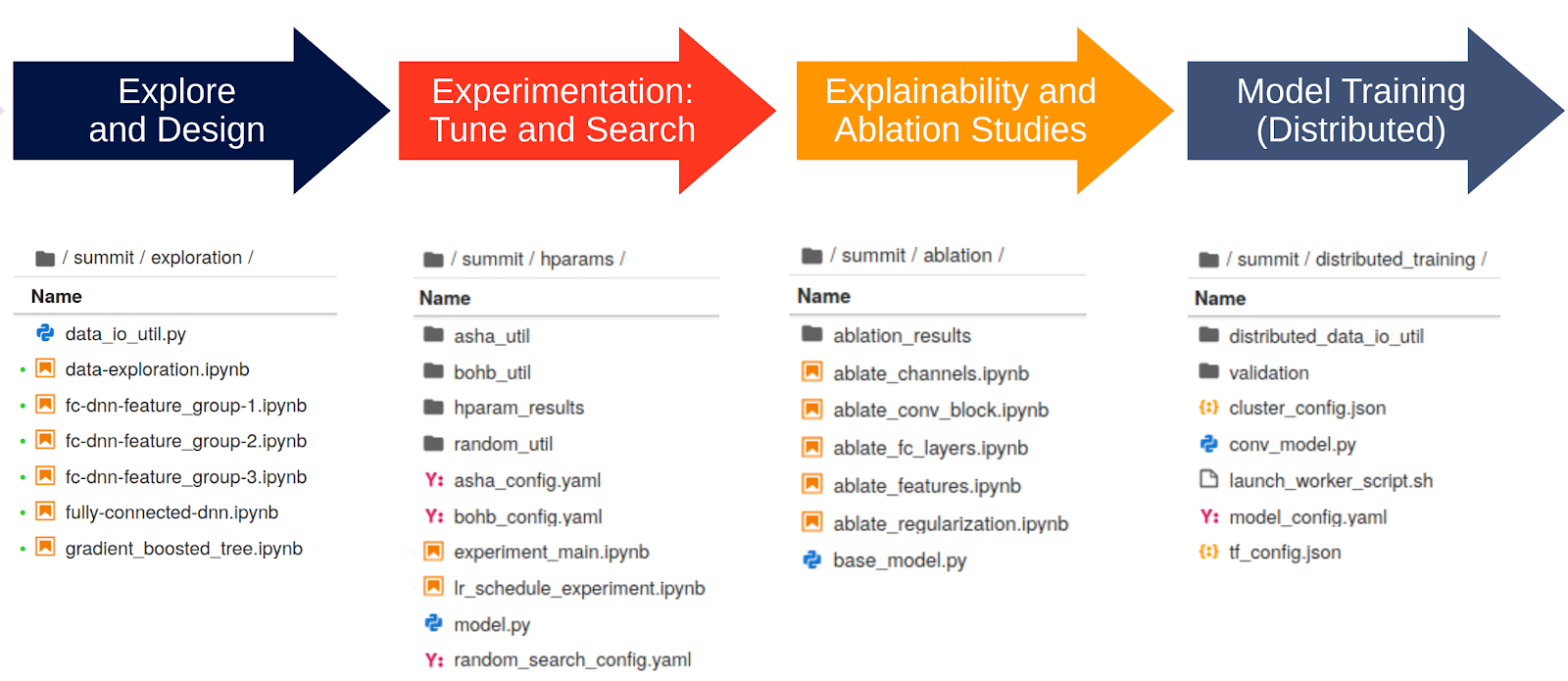 The software development process for ML models is rarely the perfect waterfall development model, as shown in Figure 1 without the green arrows. In the (discredited) waterfall development process, you would start out with requirements, then move on to design, implementation and test. The (current!) equivalent process in ML model development is the following, as shown in Figure 1 with the green arrows. You start out on your local machine with a subset of the data in order to explore and design the model architecture. Then you move to use a cluster of resources (such as GPUs) to more quickly find hyperparameters, run lots of parallel ablation studies (many skip this stage!), and finally scale out the training of the model on the large dataset using lots of resources. Then, you’re done, right? Wrong! You typically iterate through the stages, finding better hyperparameters, adding new features, rewriting for distribution, going from your laptop to the cluster and back again.