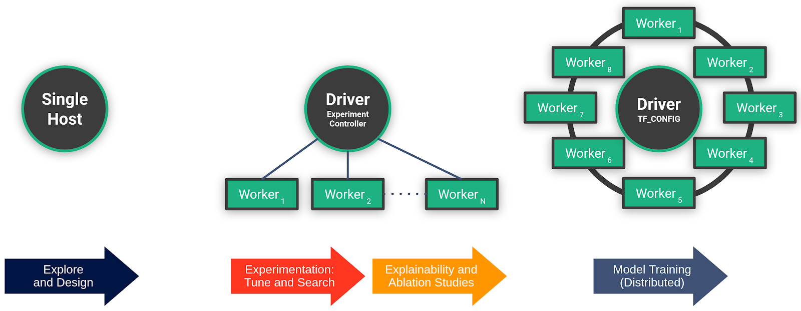 While a single-host environment is self-explanatory, there is a difference between the context of ML experiments, such as hyperparameter optimization or parallel ablation studies, and the distributed training of a single model. Both hyperparameter optimization and parallel ablation studies have weak scaling requirements (also known as embarrassingly parallel), because all workers execute independent pieces of work and have limited communication. For example, hyperparameter tuning involves training independent copies of the model with different hyperparameters or different architectures, in order to find the best performing configuration. Distributed training, however, is strong scaling, as it introduces significant communication and coordination between the workers. As workers are training a single model, they continually exchange gradients, which are computed on independent shards of data (data parallel training). Many distributed training problems, in fact, become (network or disk) I/O bound as they scale. Figure 5 illustrates the three contexts and the step in the model development process that they are applicable to.