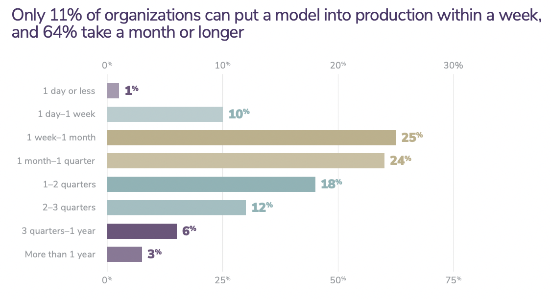 As we add infrastructure to the mix, the concept of MLOps suddenly becomes much harder, and it shows in a recent survey, which found that only 11% of organizations succeed in putting models into production in less than one week: