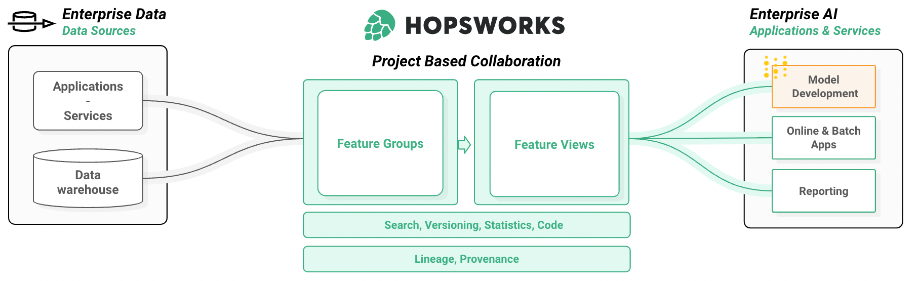 The Hopsworks Feature Store is addressing the first requirement. It provides a central funnel for all features to be used in production. With its dual database architecture, it can serve both real-time as well as batch inference and training data. Instead of having a feature pipeline for each feature-model combination, we only have a pipeline for each feature, feeding into the feature store. We provide a Feature View API, that lets developers reuse features across models without any data copying.