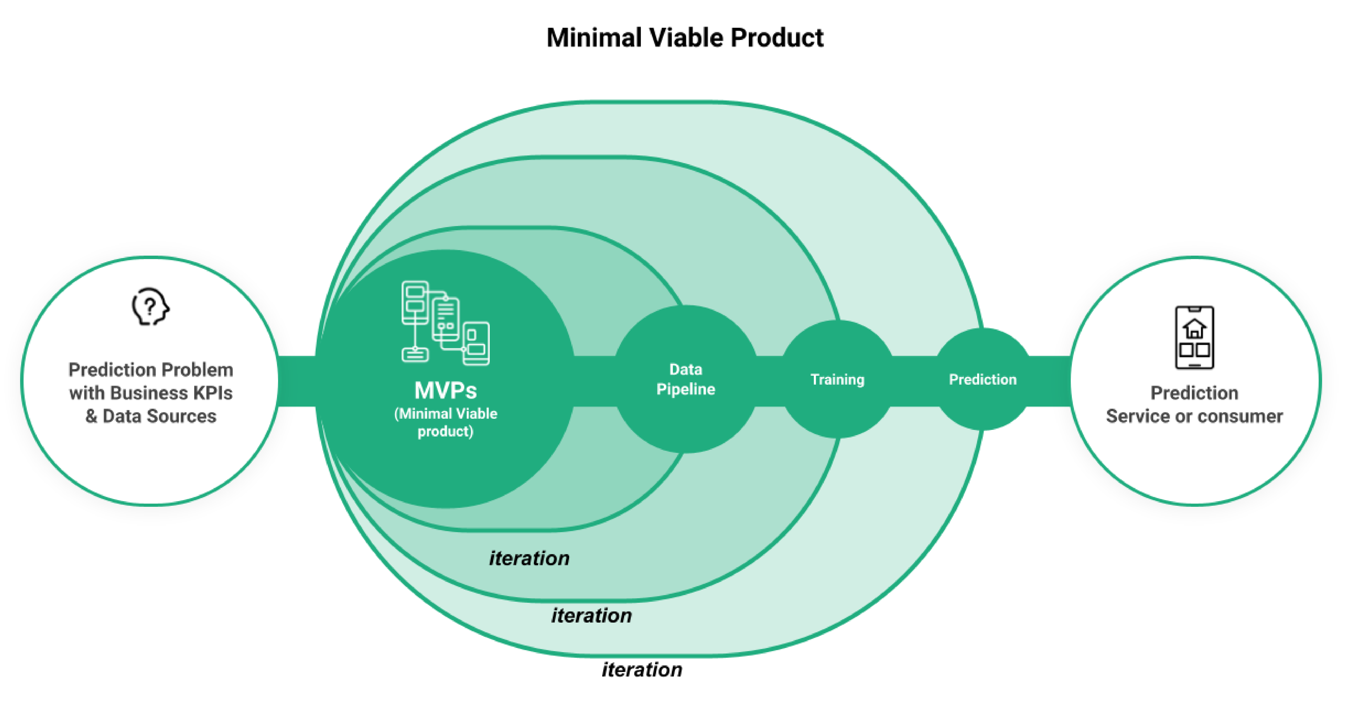After you have identified the need for faster implementation of your models, you need to set up a framework. As a result of helping and collaborating with hundreds of professionals in Fortune 500 companies, we have identified the most efficient model: create an end-to-end minimum viable product.